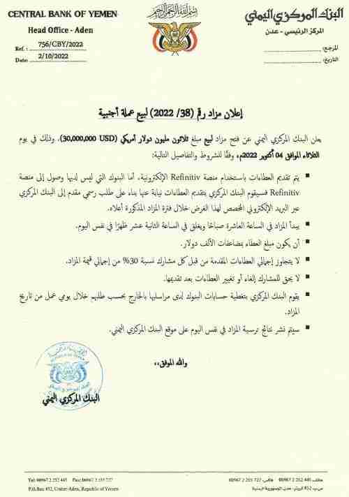 يعلن البنك المركزي اليمني عن فتح مزاد لبيع مبلغ ثلاثون مليون دولار أمريكي (30,000,000 USD)، وذلك في يوم الثلاثاء الموافق 4 أكتوبر 2022م، وفقًا للشروط والتفاصيل التالية: