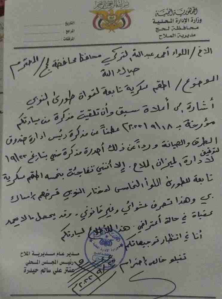 واضاف مدير عام الملاح في بلاغه انه سبق وقد تعرض للمطاردة والتهديد بالحجز او الاغتيال من قبل جنود ونقاط تابعة للواء الخامس دعم واسناد.