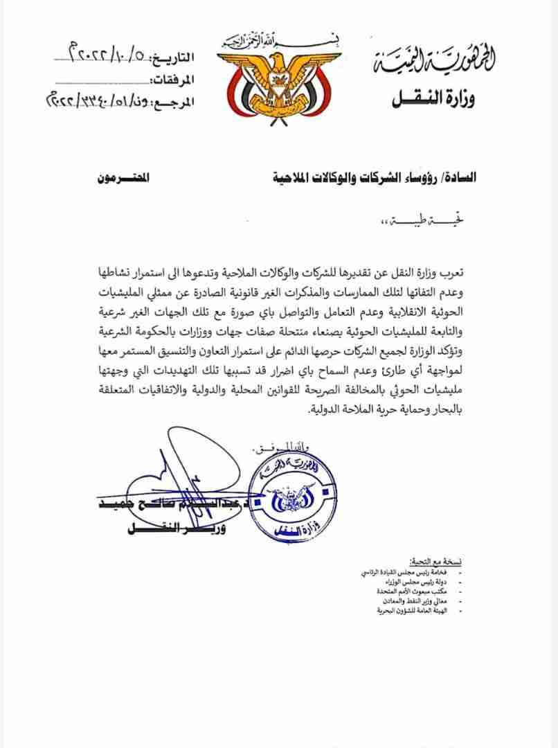 وزارة النقل تدعو الشركات الملاحية لممارسة نشاطها وعدم التعامل مع أي تعميمات صادرة عن المليشيات الانقلابية (وثيقة)