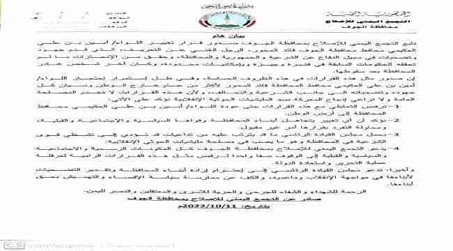 ونشر حزب الاصلاح فرع محافظة الجوف بيان أكد فيه رفضه الكامل لقرار مجلس القيادة الرئاسي، واتهم فيه التحالف العربي باحتجاز القيادي الاخواني ومحافظ محافظة الجوف السابق امين العكيمي.