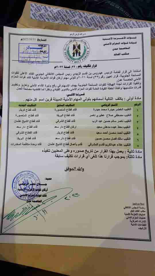 صدور قرارات بتعيين قادة قطاعات قوات الحزام الأمني في العاصمة عدن (أسماء)
