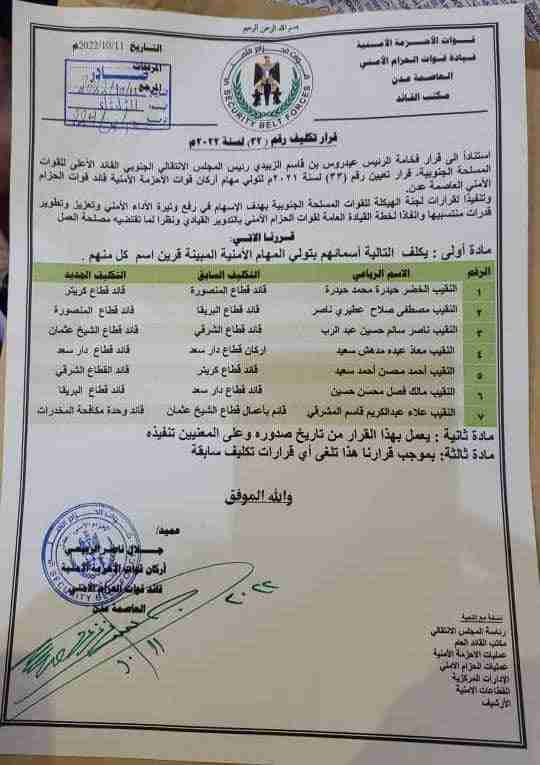 وشملت القرارات التي حملت رقم (32) لسنة 2022م، وقضت المادة الأولى منه بتكليف التالية اسماءهم بتولي المهام الأمنية المبينة قرين اسم كل منهم: