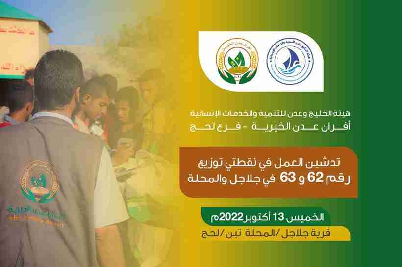 ووسعت افران عدن الخيرية من عمليات توزيعها في لحج للوصول الى مستفيدين جدد حيث تم افتتاح النقطة (62) في قرية جلاجل الواقعة على الجانب الايمن من الطريق العام الواصل بين عدن والحوطة عاصمة لحج فيما استهدفت بالنقطة الثانية رقم (63) بمنطقة المحلة الواقعة على الجانب الايسر من نفس الطريق بالقرب من مدخل الحوطة.