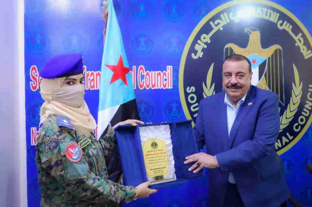 كرم اللواء الركن أحمد سعيد بن بريك القائم بأعمال رئيس المجلس الانتقالي، رئيس الجمعية الوطنية، اليوم الملازم طيار/رحمة عزالدين سلام الحوشبي