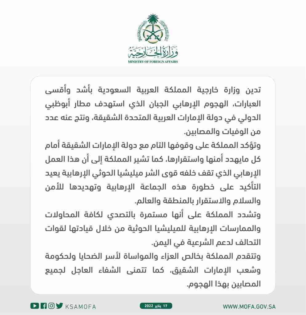 أدانت وزارة خارجية المملكة العربية السعودية بأشد وأقسى العبارات، الهجوم الإرهابي الجبان الذي استهدف مطار أبوظبي الدولي في دولة الإمارات العربية المتحدة الشقيقة، ونتج عنه عدد من الوفيات والمصابين.
