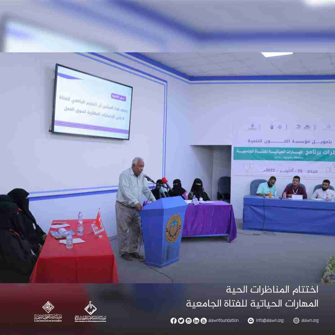 اختتمت في المكلا فعاليات المناظرات الحية لبرنامج المهارات الحياتية للفتاة التي أجريت في قاعة الأديب علي أحمد بأكثير بجامعة حضرموت الممول من مؤسسة العون للتنمية وتنفيذ مؤسسة بسمة لتنمية الطفل والمرأة.