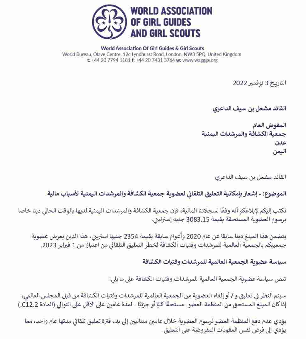 واكد المصدر أن تأخير الوزارة صرف الموازنة يهدد بشطب عضوية اليمن من المنظمة الكشفية العالمية والإقليم الكشفي العربي، مشيرا إلى ان توجيهات متعاقبة لوزير الشباب والرياضة رئيس جمعية الكشافة نائف البكري، تعرقل من قبل المعنيين في الوزارة رغم إخطار الوزير بذالك إلا أن هذا الحال استمر منذ سنوات.
