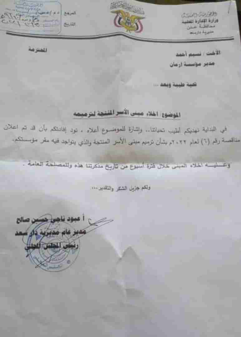 وتسلمت الأستاذة نسيم احمد رئيسة مؤسسة ارمان، قبل يومين، مذكرة موجهة من مدير عام مديرية دارسعد طالبها فيها باخلاء مبنى الأسر المنتجة الذي يتواجد فيه مقر المؤسسة، خلال أسبوع.